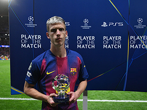 Dani Olmo không vui khi được trao danh hiệu Cầu thủ xuất sắc nhất trận Barcelona thắng Atletico Madrid 2-1 ở lượt về vòng tứ kết Champions League. |