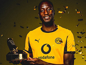Tiền đạo Serhou Guirassy rạng rỡ nhận danh hiệu Vua phá lưới Champions League trước trận đấu giữa Juventus và Dortmund. |