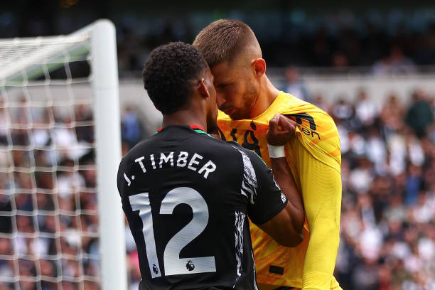 Jurrien Timber đã may mắn thoát thẻ đỏ sau 2 tình huống chơi xấu ở trận thắng Tottenham vừa qua. |